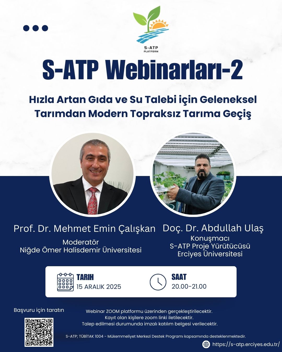 Küresel ölçekte artan gıda ve su talebi karşısında, tarımsal üretimde dönüşüm artık kaçınılmaz. Bu kapsamda S-ATP, ikinci webinarında geleneksel tarımdan modern topraksız tarıma geçiş sürecini ele alıyor. Prof. Dr. Mehmet Emin ÇALIŞKAN (Niğde Ömer Halisdemir Üniversitesi) moderatörlüğünde, Doç. Dr. Abdullah ULAŞ (Erciyes Üniversitesi), 'Hızla Artan Gıda ve Su Talebi için Geleneksel Tarımdan Modern Topraksız Tarıma Geçiş' başlıklı sunumunu gerçekleştirecek.