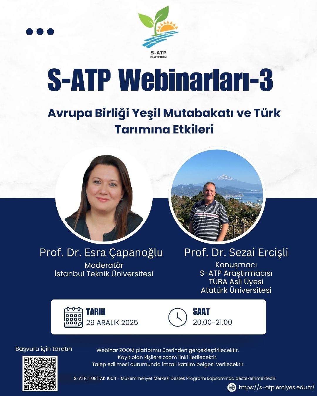 Bu kapsamda S-ATP Webinarları’nın üçüncü oturumunda, AB Yeşil Mutabakatı’nın Türk tarımı için oluşturduğu riskler, fırsatlar ve uyum stratejileri bilimsel ve politika temelli bir bakış açısıyla değerlendirilecek. Etkinlikte, Prof. Dr. Esra Çapanoğlu (İstanbul Üniversitesi) moderatörlüğünde, S-ATP Araştırmacısı, TÜBA Asli Üyesi Prof. Dr. Sezai Ercişli (Atatürk Üniversitesi) 'Avrupa Birliği Yeşil Mutabakatı ve Türk Tarımına Etkileri' başlıklı sunumunu gerçekleştirecek.