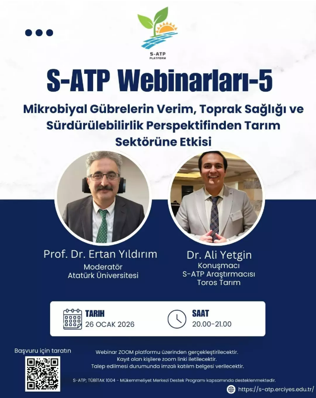 S-ATP Webinarları’nın beşinci oturumunda, “Mikrobiyal Gübrelerin Verim, Toprak Sağlığı ve Sürdürülebilirlik Perspektifinden Tarım Sektörüne Etkisi” başlığını; bilimsel bulgular, saha deneyimleri ve sektör uygulamaları ışığında ele alıyoruz. Etkinlik Prof. Dr. Ertan Yıldırım (Atatürk Üniversitesi) moderatörlüğünde, platform APYK'larından Toros Tarım A.Ş.'nin araştırmacısı Dr. Ali Yetgin'in sunumuyla gerçekleşecek.